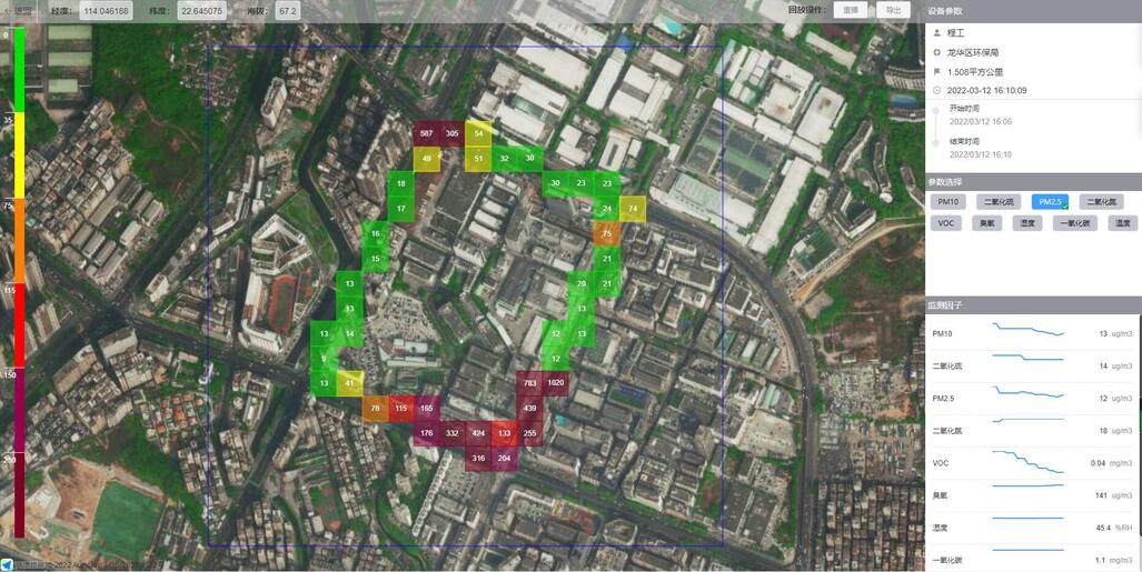 界面可顯示濃度數(shù)值、曲線、污染2D網(wǎng)格分布與實景信息的對應一目了然,更加有效地輔助用戶發(fā)現(xiàn)污染問題。