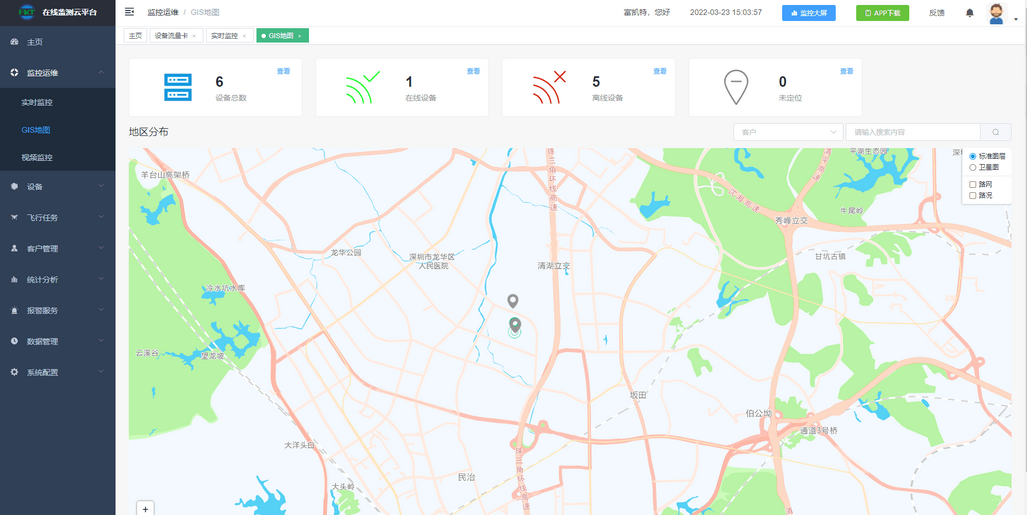 GIS地圖中會展示設備所在位置,點擊設備圖標則會展示設備數(shù)據(jù)及相關數(shù)據(jù)信息。